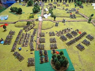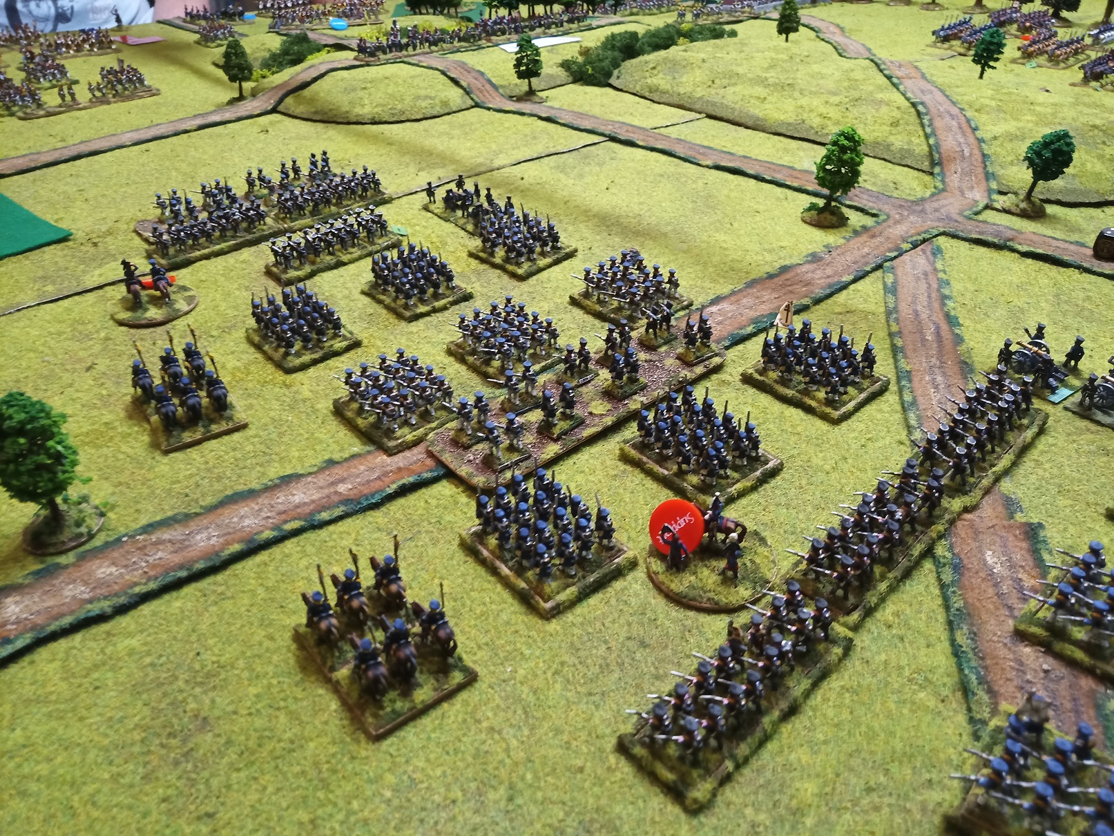 Opening moves. Prussians pushing cavalry on the flanks and the infantry intending to punch the left of centre. Room was left in the centre for the artillery reserve to deploy once they arrive.
